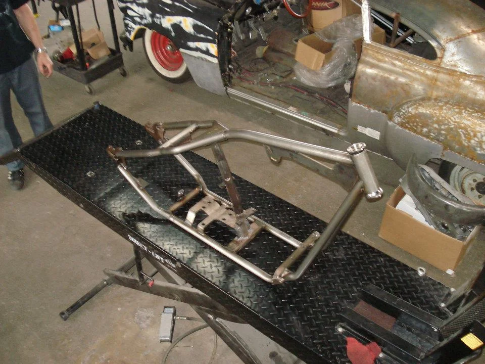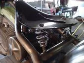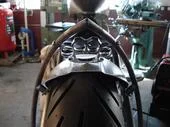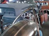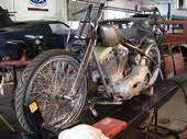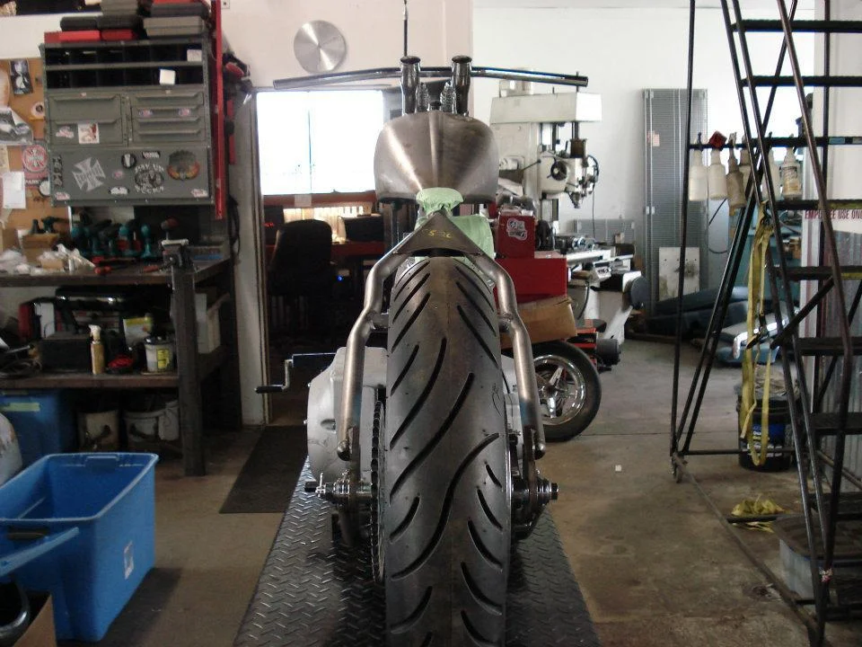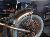 Full mock up of bike, mounting of gas tank, oil bag, fender, seat, and custom hand built rear fender support. The rest of the work was done else where....